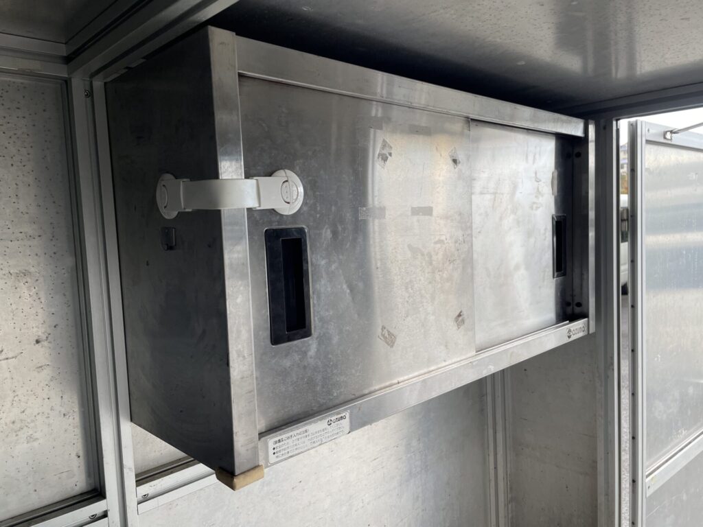 アルミ製のBOXで、内部を丸々水洗いできます。また、チラシやタペストリーを貼りやすいです。