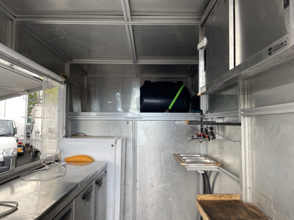 設備:3枚扉 冷凍冷蔵コールドテーブル、冷凍ストッカー(80L)、3槽シンク、100Lタンク×2個、棚×3個、換気扇、外部給電コンセント